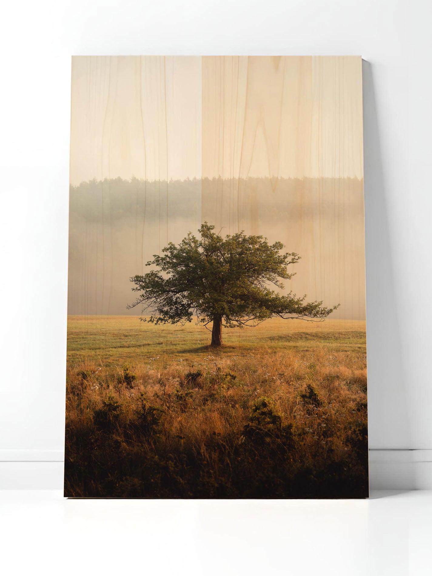 Ein einzelner Baum erhebt sich aus dem goldenen Licht des Morgens, umgeben von Stille, Nebel und der erwachenden Natur. „Morgenast“ fängt diesen friedlichen Augenblick ein, in dem die Welt noch ruht und doch bereits voller Leben steckt. Die weiche Lichtstimmung und das einsame Motiv wirken beruhigend und tief – wie ein visueller Atemzug. Dieses Wandbild auf Holz bringt Klarheit und Erdung in jeden Raum. Es erinnert an die Kraft des Alleinseins, an das Innehalten und den Zauber neuer Anfänge. Perfekt für alle, die mit ihrer Wandgestaltung bewusst Ruhe, Naturverbundenheit und Minimalismus ausstrahlen möchten.