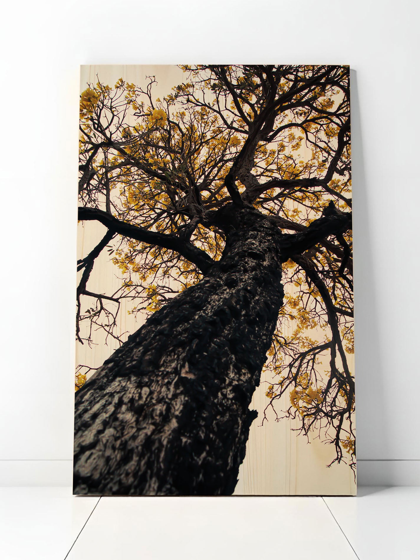 Wie ein Blick in die Krone der Gedanken: „Zweigsinn“ zeigt einen Baum aus ungewöhnlicher Perspektive – von unten nach oben, den Blick entlang der rauen Rinde bis hinein in ein feines Netz aus Ästen und Blüten. Dieses Motiv verbindet Stärke und Zerbrechlichkeit, Erdung und Aufbruch. Die warme Lichtstimmung und der kraftvolle Stamm schaffen eine eindrucksvolle visuelle Tiefe. Das Holzbild wirkt fast meditativ, erinnert an das eigene Wachsen, an Verwurzelung und neue Wege. Es ist ideal für moderne Holzbilder mit Bedeutung – für Räume, die inspirieren, beruhigen und gleichzeitig Kraft spenden sollen.